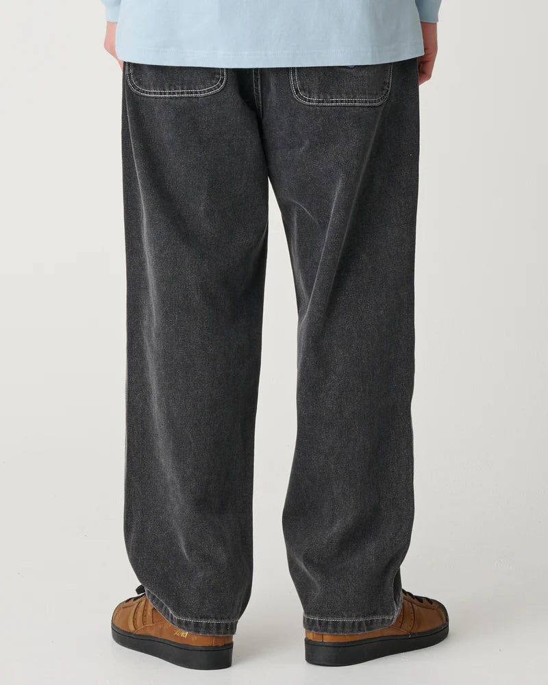 The Whistle Bull Denim 91 Pant in Washed Black is a fixed-waist loose fit. Featuring an extra-wide cut leg in a washed denim, they have an oversized waist with an extended rise and roomy thigh.